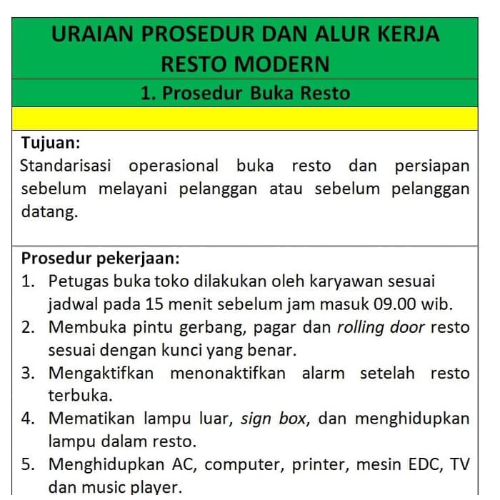 Contoh SOP HRD Download Sekarang dan Konsultan Sistemasi Bisnis dan SOP Serta Konsultan ISO dengan Master SOP Alim Mahdi Katalog SOP. Pengertian SOP Standard Operating Procedure in English adalah pedoman dan panduan terdokumentasi yang berisi metode khusus untuk melakukan tugas atau pekerjaan secara konsistenContoh standar operasional prosedur sekolah toko retail lembaga pengelola zakat unit kerja rekam medis zoom meeting usaha kuliner sop buah dan sop ayam. Selain memiliki SOP tanggap darurat IPAL suatu perusahaan juga wajib memiliki SOP penanggulangan bencana termasuk didalamnya bencana kebakaran yang berpotensi terjadi.
